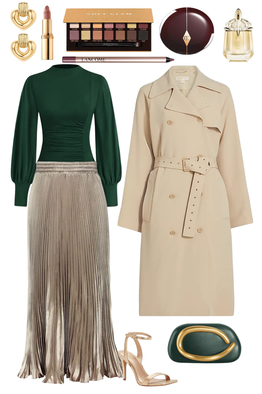 This look is the definition of “glam without trying too hard,” thanks to the pairing of rich forest green and soft gold metallics. The polished silhouette and luxe textures make it perfect for any holiday work party where you want to look festive, elegant, and completely effortless. Tuck your blouse for shape, go for soft glam makeup and a glossy lip, and finish with sleek hair to keep everything refined.