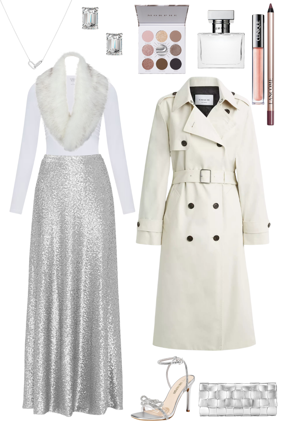 Long Maxi Sequin Skirt | Faux Fur Collar Scarf | V-Neck Long Sleeve Bodysuit | Evening Clutch | Pendant Necklace | Emerald Cut Earrings | Ralph Lauren Eau de Parfum | Morphe Eyeshadow Palette | Lancôme Lip Liner | Clinique Lip Gloss | Crystal Sandals | Long Trench