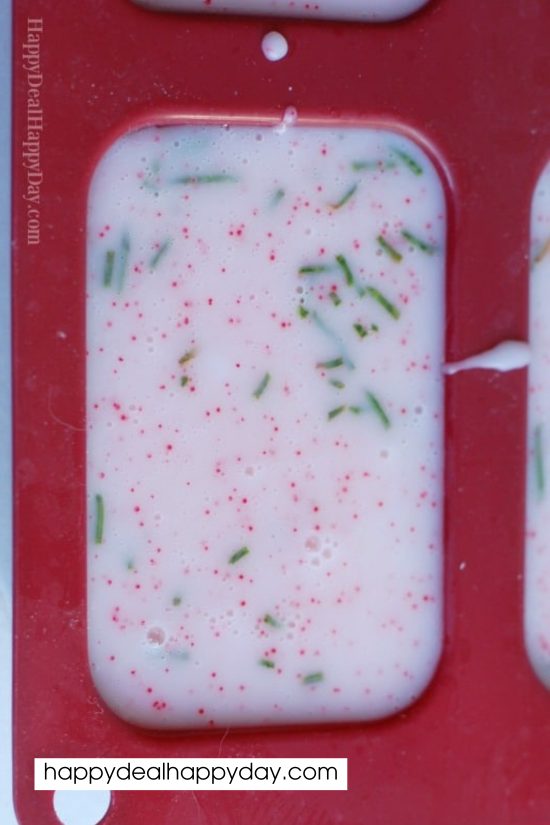 Pour the soap into molds shaped like snowflakes, Christmas trees, or candy canes, and let it set.